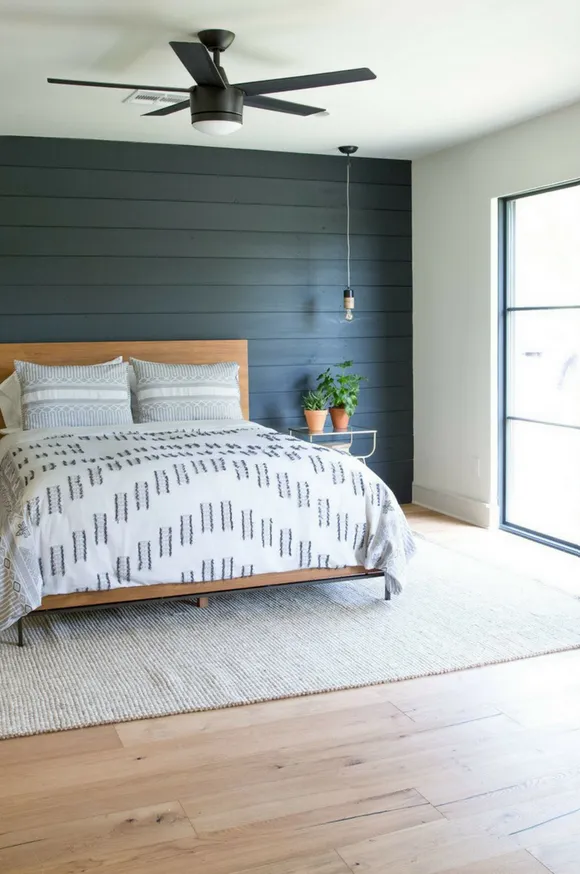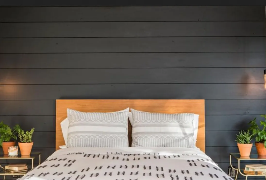 Go dark. Black or charcoal shiplap behind the bed is bold, moody, and surprisingly sophisticated.
