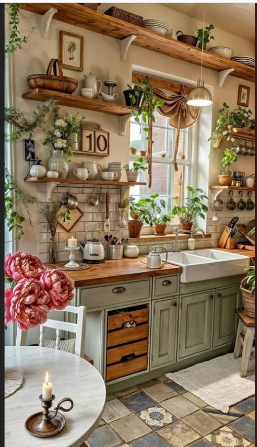 Not pastel and airy like the usual Pinterest cottagecore boards, but moody—deep greens, warm wood, flickering candlelight. A kitchen that feels like a little enchanted hideaway. Think “witchy cottage in the forest,” but also functional enough to store your cereal boxes.