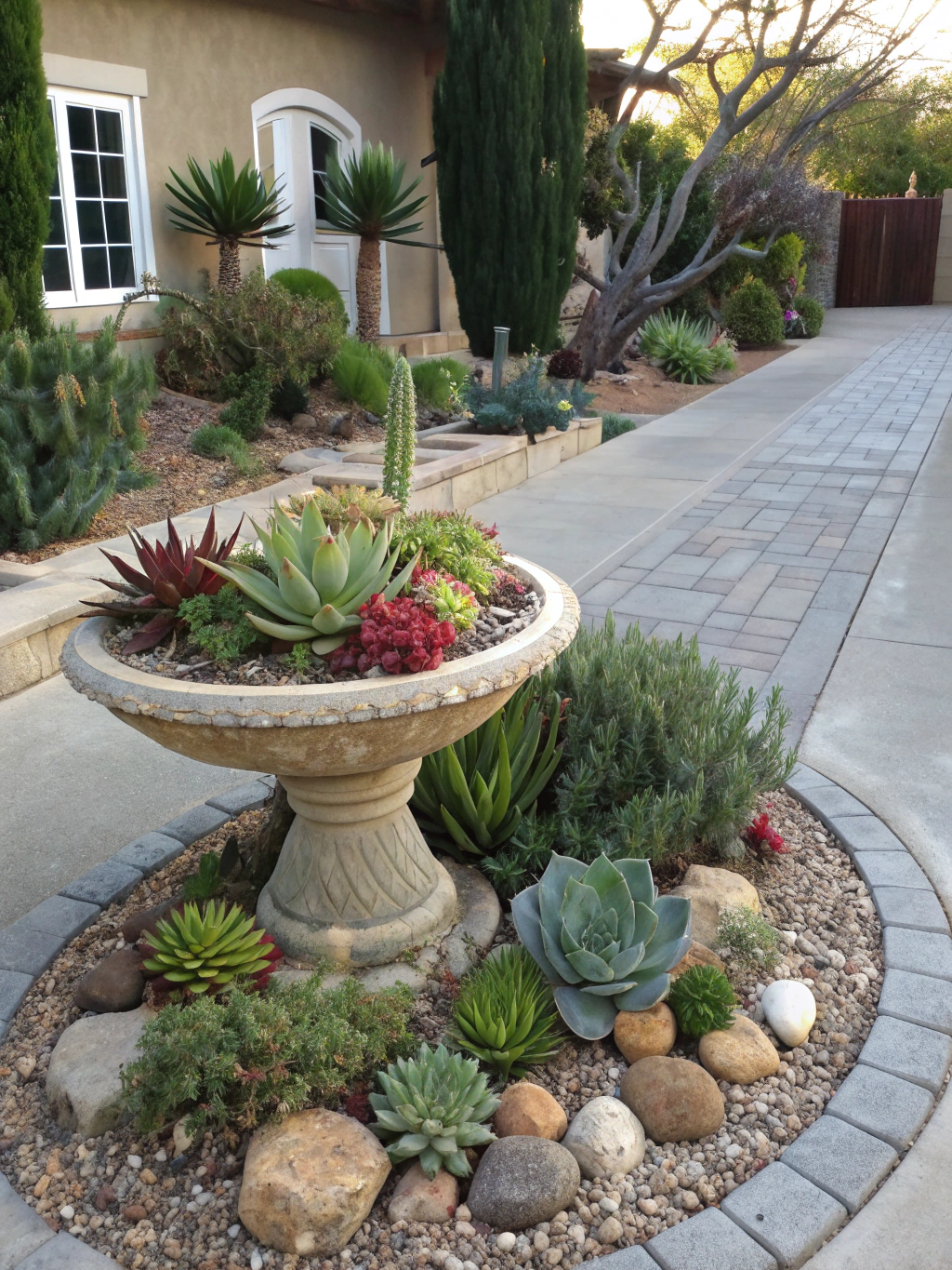 Finally, don’t forget to add a touch of whimsy! Garden art, sculptures, or even a DIY bird bath can spice up your grassless front yard. A do-it-yourself stepping stone project is a fun way to repurpose materials and upgrade the landscape. You could even use leftover paint cans and create a little herb spiral to encourage your culinary creativity.