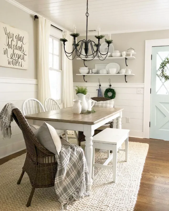 If the dining table isn’t right, nothing else matters.Ours is a reclaimed wood table I found on Facebook Marketplace for $200 — which, by the way, was an adventure. The seller was in the next town over, and I ended up recruiting my cousin (and his truck) to help. It has scratches, yes, but that’s kind of the point. Modern Farmhouse style is all about that lived-in charm.
