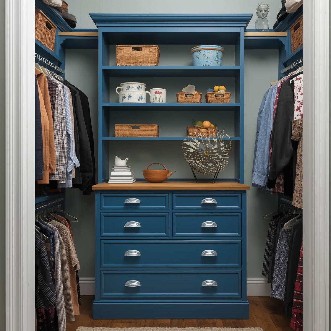 For my own closet, I experimented by painting the top half a vibrant teal and the lower half a rich mustard. It sounds crazy, but it feels like I’m living in an art gallery! Sometimes I catch my cat lounging dramatically on the lower shelf, and it’s perfect.